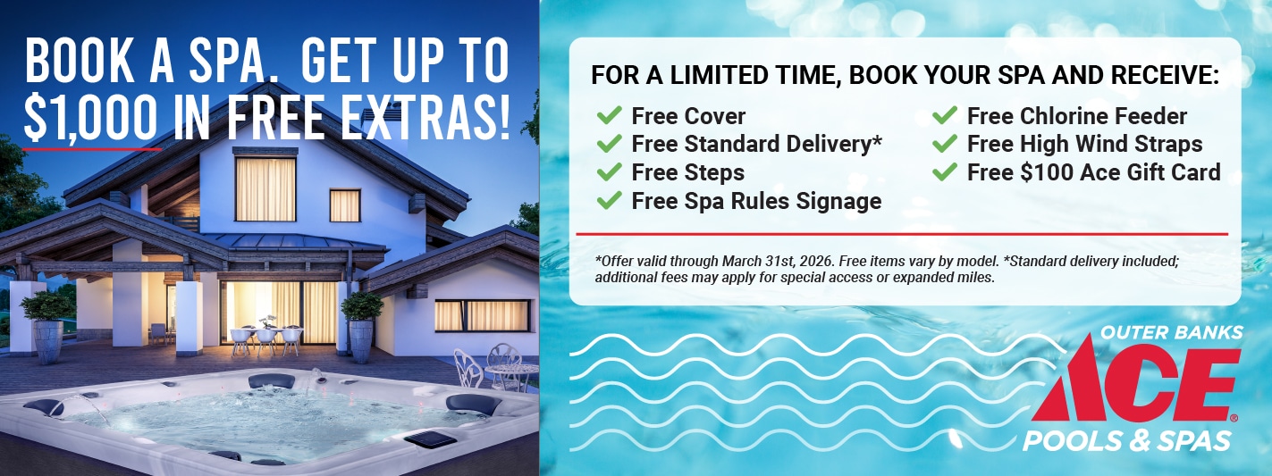 We’ve since expanded our services to include chemicals, parts, pumps, motors, maintenance equipment and accessories. At Ace Pools and Spas, we understand the value and maintenance challenges involved with cottage rentals, which is why we also offer custom spas made specifically for the Outer Banks environment.