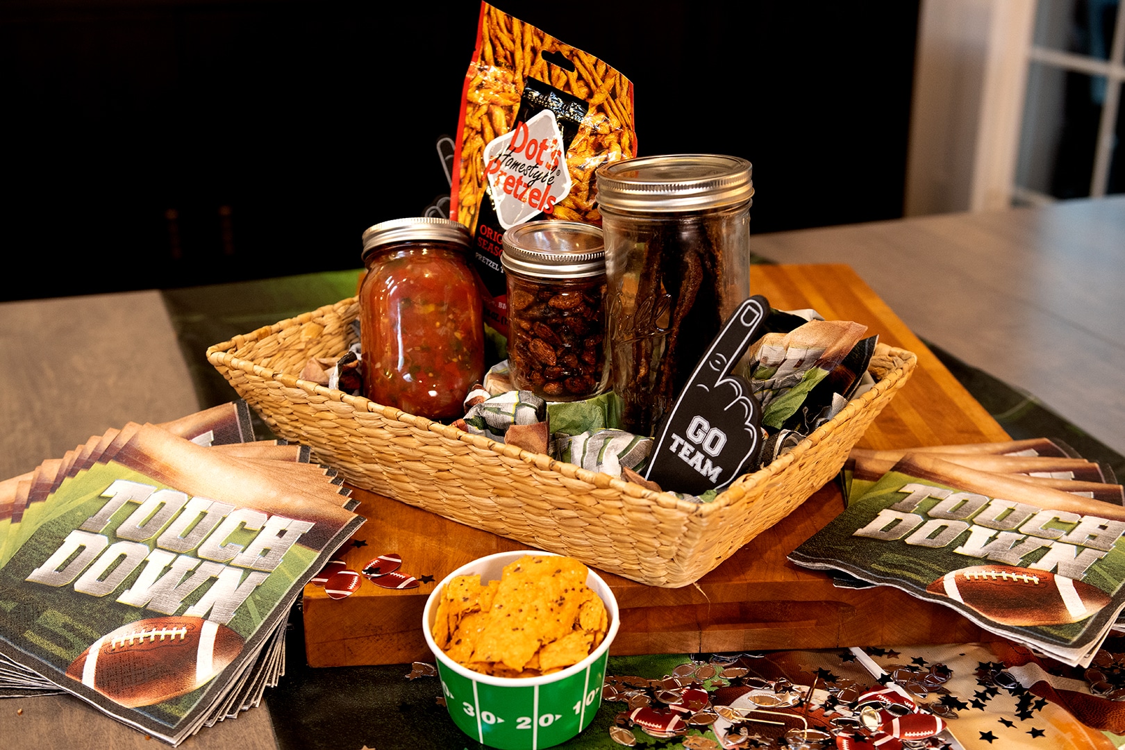 Create football-themed “pack and go” boxes for easy delivery to your online guests.