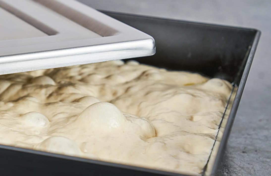 After that, dimple it again using your fingers, pushing it towards the corners of the pan.