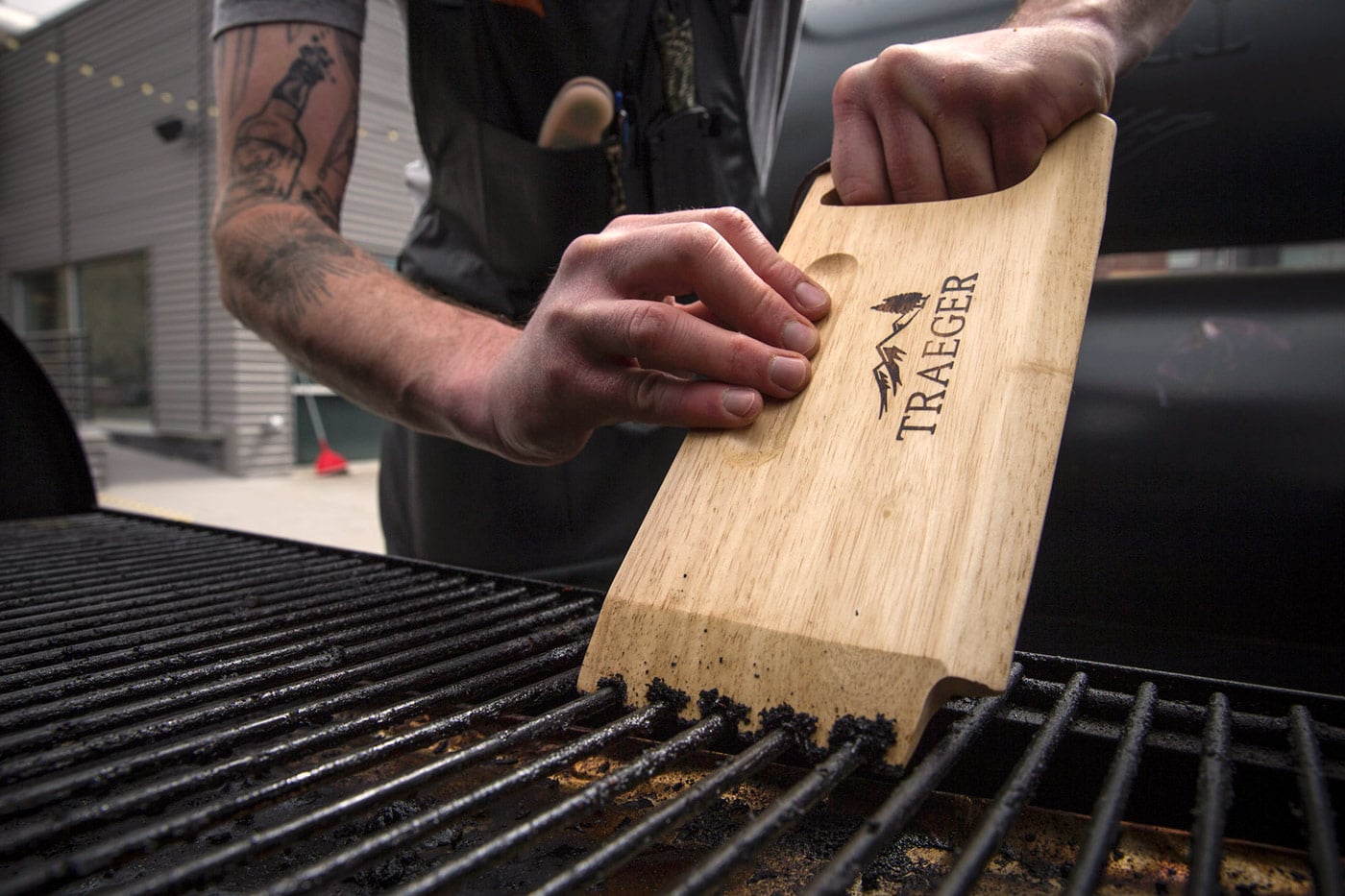 - Finally, scrape any debris from inside the bottom and sides of the cook box using a straight, flat-edged scraper, letting it fall into the removable tray pan. Slide out and clean up the debris with a plug in or cordless shop vac. Wipe the inside of the grill clean with warm soapy water and a scrubbing pad. Empty the debris from the tray into the trash and replace any disposable drip pans.