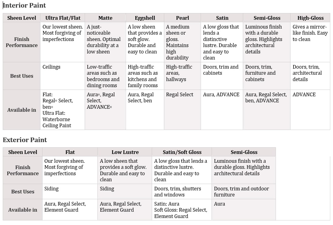 Our friends at Benjamin Moore Paints have created a quick chart for paint sheen uses. Why? Because everyone’s home is different. Depending on the size and era it was built in, you may have a home with several material types that compose your walls, archways, window frames, ceilings and so much more.