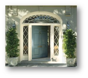 Don’t Be Shy: Since it’s a relatively small area compared to the rest of the house, you can afford to take risks with the front door and be more adventurous with color. When choosing front door colors for a dark or brick house, try Concord Ivory HC-12 or a classic red to brighten it up and coordinate with bright flowers. If your home is painted in a lighter color, try a more fashion forward option like Wythe Blue HC-143 and complement it with a garden of flowers in simple whites and lots of green.