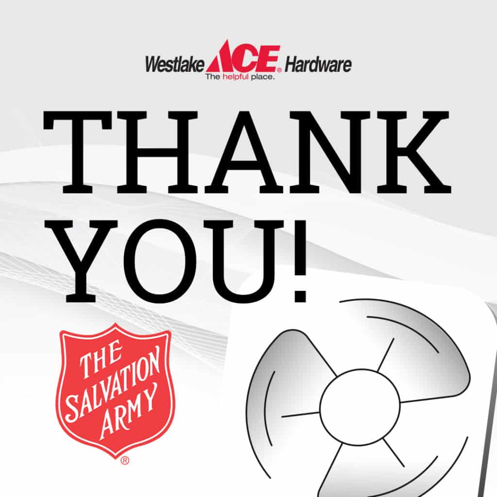 During the first three weeks of June, Westlake Ace customers were asked to donate to the Fan Drive by rounding up their purchase at the register. The donations were then tallied, and fans provided at cost by Westlake Ace. The hardware retailer donated an additional 750 fans to the charity resulting in nearly 6,300 fans given this summer to Salvation Army locations across the nation.