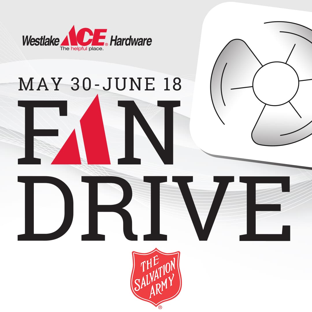 Customers at Westlake Ace Hardware stores will be encouraged to donate to the cause by rounding up their purchases at the register. All donations will go towards purchasing new box fans for local Salvation Army commands. Westlake Ace has pledged to kick off the event with a donation of 750 fans.